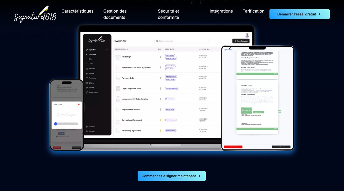 Signez tous vos documents numériques dès aujourd’hui avec Signature1618, notre plateforme de signature révolutionnaire, conçue pour la sécurité et une efficacité de pointe. Signature1618 est en totale conformité avec les normes du GDPR sur la confidentialité des informations.
